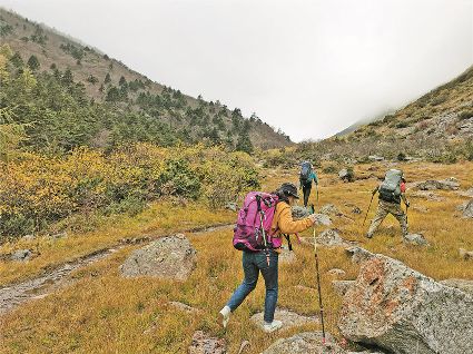 一般徒步線路需要三天完成,第一天從康定折多塘開始徒步,進入毛家溝后一路緩上坡經(jīng)過美麗的荒野,下午就可以到達蘭尼巴埡口扎營。第二天上到山脊觀貢嘎主峰以及衛(wèi)峰小貢嘎、嘉子峰、愛德嘉峰、日烏且峰、勒多曼因,還能看到雅拉雪山和美麗的云海金山。第三天原路返回,或經(jīng)木雅圣地去新都橋或翻過埡口去甲根壩,最推薦的是從蘭尼巴山脊繼續(xù)前行到達恩支漫希湖,沿雅哈埡口、桑恩措、冷嘎措、泉華灘、木居海、里索海、子梅村、貢嘎寺、巴王海,連接貢嘎穿越線,沿途的風光更加動人。