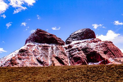 新龍紅山丹霞主要發(fā)育以丹霞石柱、峰叢、方山、石墻、石洞、崖壁等以及各種造型石為主的地貌特征,遠(yuǎn)遠(yuǎn)望去,雄偉壯觀、千姿百態(tài)。因大部分山峰高出雪線,受冰川作用影響顯著,北坡河谷部分有常年片狀積雪覆蓋。