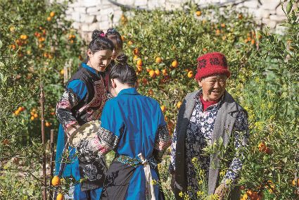 不遠(yuǎn)處,農(nóng)家大哥左握微型秤,旁邊框框紅艷艷草莓待稱(chēng),右拿手機(jī)收付款。穿過(guò)溪流木橋,黃四娘家青果累累,爍爍梨花下,女兒正梳妝挽云鬢;沈家河壩菜花黃黃,別院人聲鼎沸。遙想當(dāng)年,坡陡路險(xiǎn)。而今,鄉(xiāng)村振興,片片梯田,阡陌交通,戶(hù)戶(hù)通路。雨天一身泥,晴天一身灰已不復(fù)返。