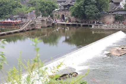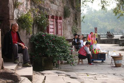 大榮橋。這座建在瀨溪河上、歷經(jīng)數(shù)百年的古石橋,一頭連著大足的地盤,一頭連著榮昌的地盤,故名??创髽s橋的最佳觀景點(diǎn)設(shè)在大榮寨對(duì)面的萬(wàn)靈山腰,從那里看大榮橋和橋拱那端毗鄰的大榮寨,一種看白描連環(huán)畫中古鎮(zhèn)的感覺(jué),就冉冉升起了。