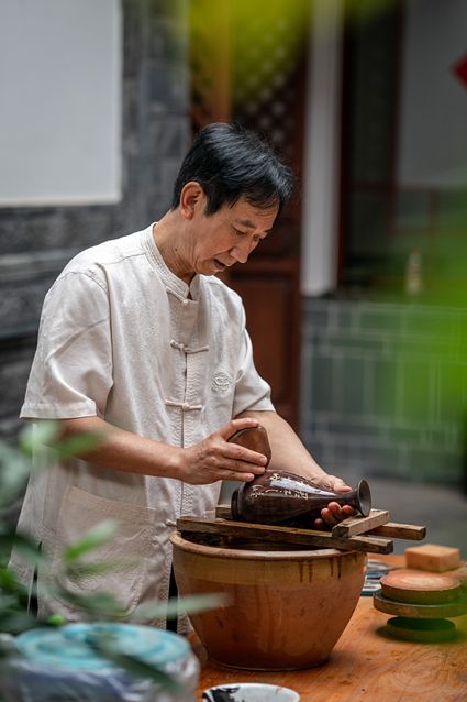 生活在云南省紅河哈尼族彝族自治州建水縣碗窯村的徐榮洪是當(dāng)?shù)匦旒腋G的第五代制陶藝人,也是非遺建水紫陶燒制技藝的傳承人。 泥料制備、拉坯造型、濕坯裝飾、雕刻填泥、高溫?zé)?、無(wú)釉磨光……要想做出精良的紫陶工藝品,每個(gè)流程都需要潛心鉆研?!爸谱骷妓嚟h(huán)環(huán)相扣,某一道工序出現(xiàn)紕漏,燒出來(lái)就是瑕疵品?!?徐榮洪拿起刻刀,對(duì)陶坯表面開(kāi)始進(jìn)行雕刻。 今年57歲的徐榮洪小時(shí)候就跟著長(zhǎng)輩上山挖陶泥,多年來(lái)堅(jiān)持鉆研建水紫陶的制作技藝。 徐榮洪介紹說(shuō),作為紫陶藝人,以陶為紙,根據(jù)器型將不同的文化與藝術(shù)形式注入其中,使其具有無(wú)限活力。非遺文化閃爍著人類智慧的光芒,也承載著人們心底的情思鄉(xiāng)愁。
