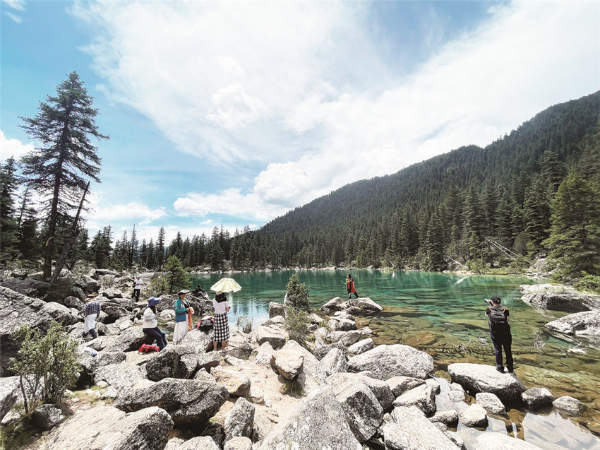 措普溝匯集了山川景物的精華,雪峰、冰川、原始森林、湖泊、河流、峽谷、瀑布、溫泉、草原、野生動植物、藏族風(fēng)情。特別是被雪山半環(huán)繞的措普湖,有山有水,顏色層層遞進,清澈見底,在陽光的折射下波光粼粼。