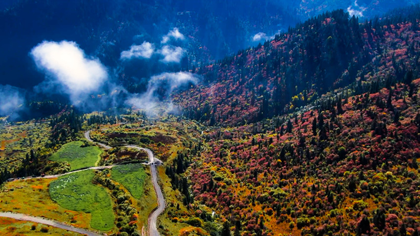 時(shí)光不語,偷施魔法,大自然手持五彩的紅、黃、藍(lán)、綠、白調(diào)色盤,將道孚的秋天潑灑成童話的世界。