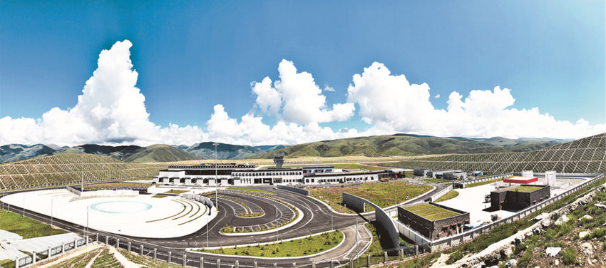 飛機還在空中盤旋,就能看到格薩爾機場大面積的綠植,清新養(yǎng)眼。這座高原機場很有意思,樓體頂層覆蓋植物土,并在室外區(qū)域大面積綠化,讓游客身在空中就能看到大片高原綠,配上兩旁的皚皚雪山,隨手一拍都是大片。