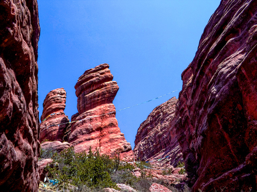 這套巖石較為粗糲,固結程度較差,抗風化能力相對較弱,因而阿色丹霞很難見到陡峭的山崖、連綿的絕壁長墻,這與廣東丹霞山“頂平、身陡、麓緩”的“丹霞標準像”截然不同。