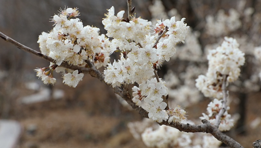 來到浪漫櫻桃谷,遠遠望去,那層層疊疊的櫻桃花團團若絮,裊裊如煙,如一條條白色的玉帶輕繞在山腰傳遞著濃濃的春意,一簇簇雪白的櫻桃花含苞競相綴滿枝頭,爛漫若云。