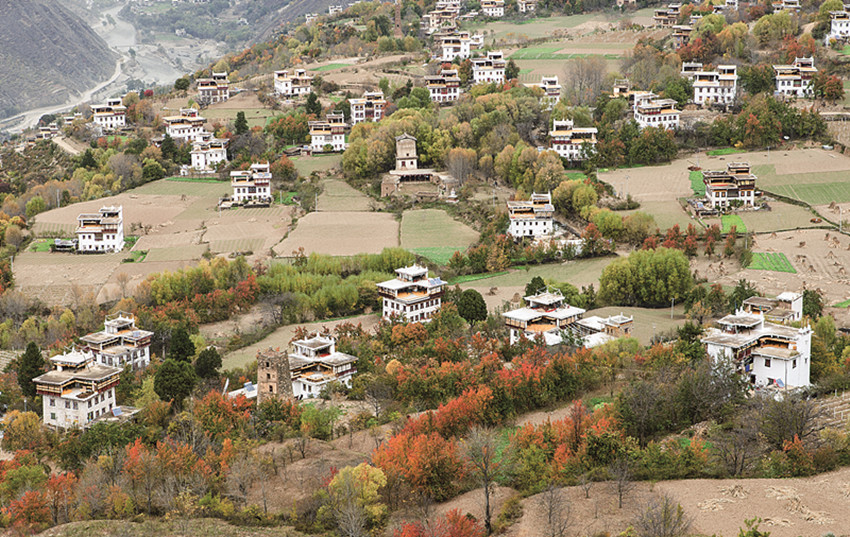 四季更迭,中路藏寨的魅力各異。秋天,正是藏寨最為絢爛的季節(jié)。造型獨(dú)特、別致的藏式民居,蜿蜒曲折的林間小道,組成了一幅美不勝收的畫(huà)卷。藏寨依山勢(shì)迤邐連綿,分布在相對(duì)高差近千米的山坡上,藏式樓房灑落在五彩斑斕的彩林中,與山谷、溪流、雪峰交相輝映,極富層次,構(gòu)成了一幅恬靜如詩(shī)的優(yōu)美畫(huà)卷。