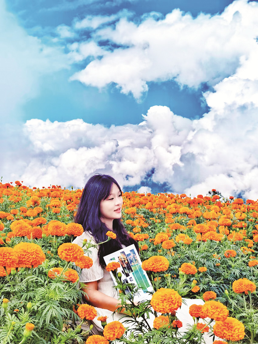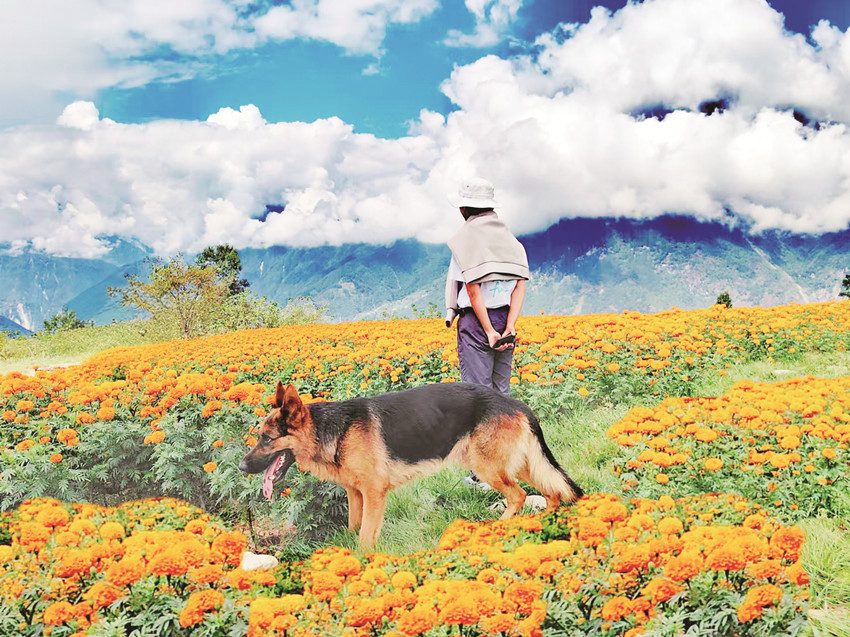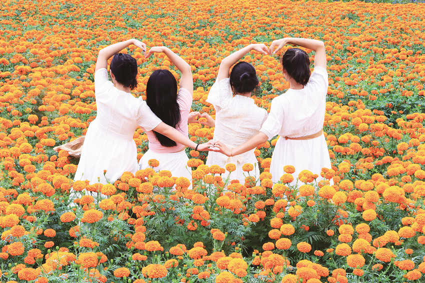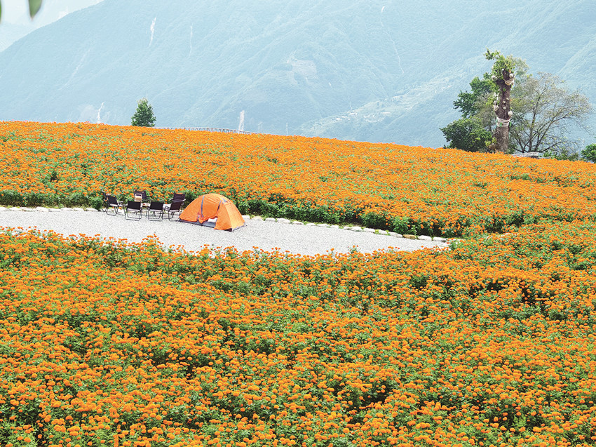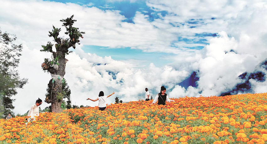 在這金風(fēng)送爽的秋日,瀘定德威加郡海子村18萬株萬壽菊競相綻放,漫步在花海之中,人們可以感受秋風(fēng)的輕撫,呼吸清新的空氣,寧靜的村寨依托著貢嘎雪山、藍天白云,在成片的萬壽菊裝點下構(gòu)成了一幅亮麗的鄉(xiāng)村畫卷。