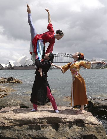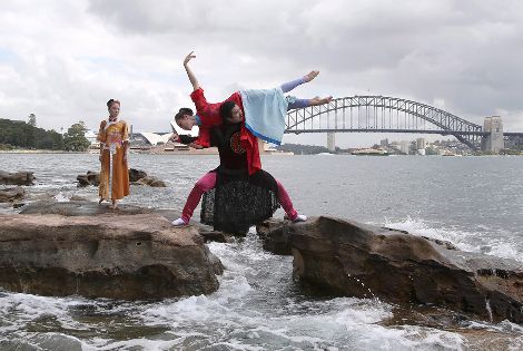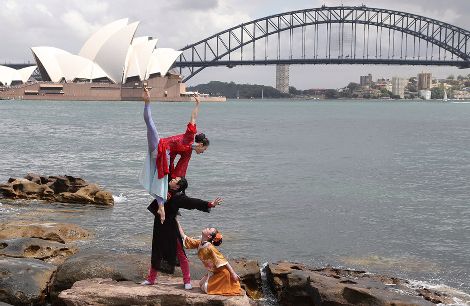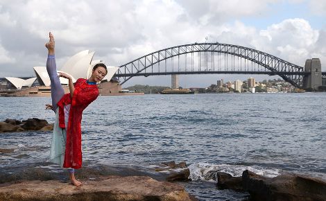 2014年2月17日,澳大利亞悉尼,中國女孩在悉尼歌劇院和海港大橋前跳起芭蕾舞。
