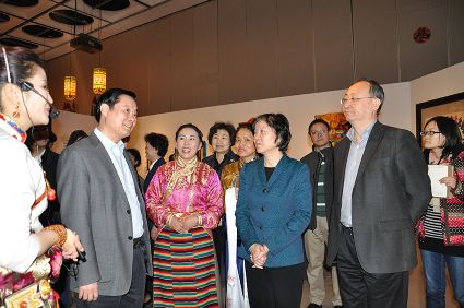 穆黎代表甘孜州婦聯(lián)向劉奇葆獻(xiàn)上藏繡哈達(dá)。