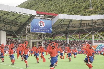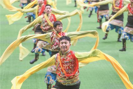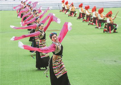 8月8日上午,康定北門體育場內(nèi)歌舞升平、彩旗飄揚,第九屆康巴藝術節(jié)開幕式文藝演出在此進行最后一次帶妝彩排。本次彩排也讓我們對開幕式文藝演出充滿了期待。