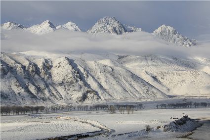 在接下來的路途中,停車休息的瞬間,一個臨水的村莊出現(xiàn)了。經(jīng)過昨夜的一場大雪,整個村子出人意料的“安靜”,河對岸牧民放馬的聲音,那個到河邊放下水桶汲水的女人取水的動靜,似乎都被一場雪過濾了。我即使走到河邊,也難以通過耳朵和眼睛接近這一切。一幅無聲的畫面更貼近一場雪。我放下手中的相機,似乎也在放下一些多余的東西,尊重著一種留白。