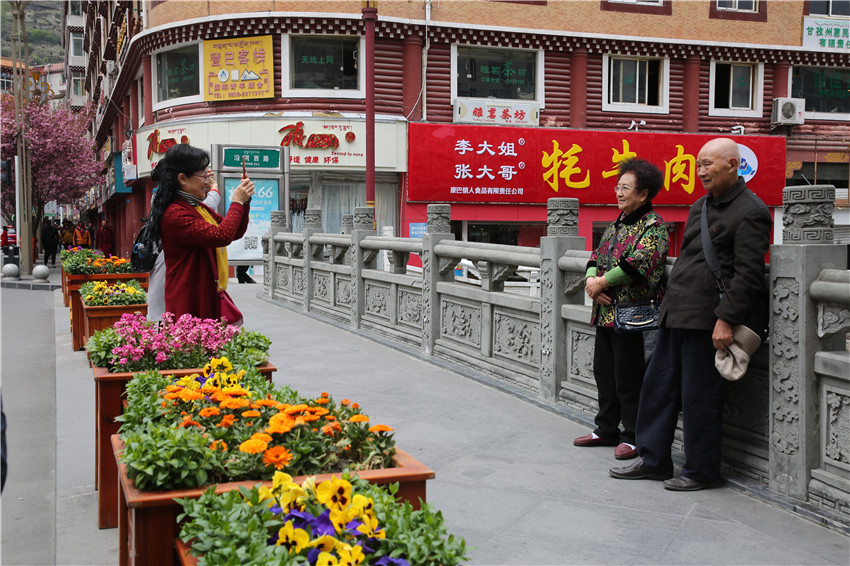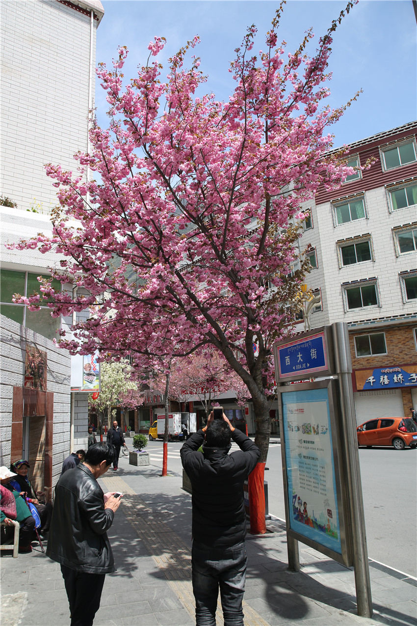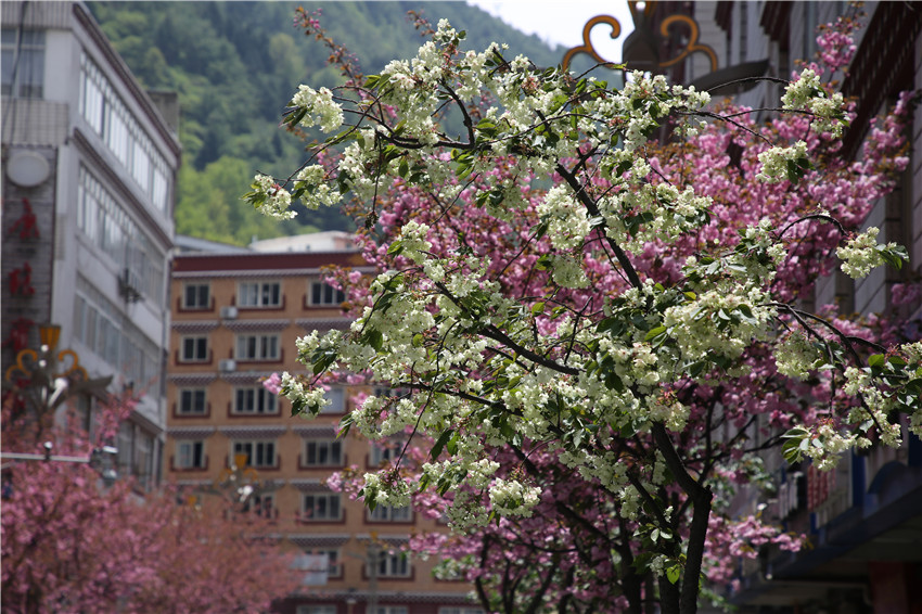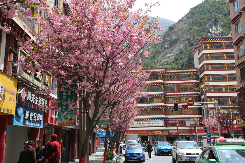 當(dāng)春天遇見最美的櫻花時(shí),驚艷了整個(gè)康定。櫻花與身邊人都將成為春日里的浪漫風(fēng)景。櫻花之美,美在氣勢(shì),櫻花紛飛,夢(mèng)幻唯美。每年4月中旬,康定城北門的櫻花綻放后,人們像是約好了一樣聚集到這里,共赴這一場(chǎng)甜美盛宴。這一路繁花似錦,人們穿過枝椏花正盛的櫻花林,穿過粉色海洋,徑直奔向一個(gè)浪漫的童話,一路櫻花飄散,一路粉光燦爛。櫻花絢麗繽紛、陸續(xù)綻放,若恰逢一陣春風(fēng)經(jīng)過,櫻花瓣隨風(fēng)舞動(dòng),猶如紛落的雪花,空氣中浮動(dòng)著櫻花特有的淡淡香氣,令人不禁懷疑自己置身夢(mèng)境?!翱刀ǖ拇禾靵淼靡硪恍`放的櫻花,滿街的花草,折多河畔楊柳依依,康定的春天無比驚艷,醉了游人。”周先生一邊拍照,一邊感嘆,他在康定生活了40多年,20年前的康定,可以說找不到像樣的花草樹木,進(jìn)入新時(shí)代,康定城市變美了,城市綠化走在了前面,城市的美譽(yù)度舒適度不斷提升??刀ㄖ?,春色滿園,姹紫嫣紅,風(fēng)光旖旎。
