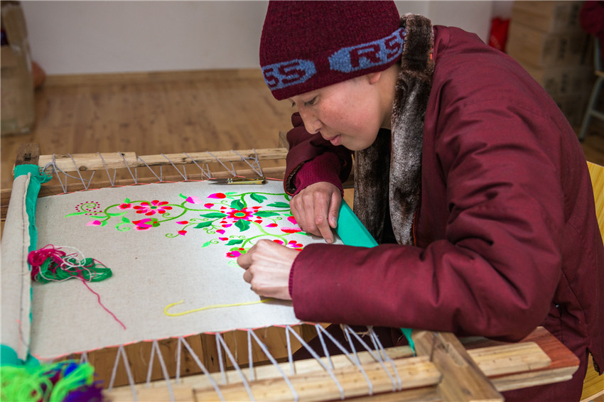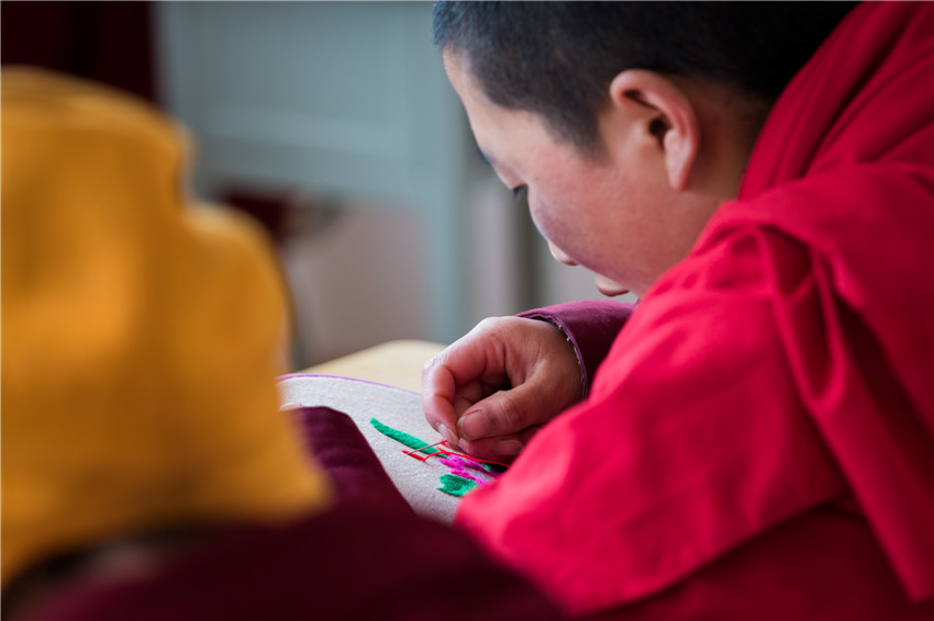 行攝途中經(jīng)過塔公鎮(zhèn)扎西寺,遇見康定市婦聯(lián)邀請到的中國國家級非物質(zhì)文化遺產(chǎn)藏羌織繡傳承人,正在為自愿報名的數(shù)十名覺姆傳授藏繡圖案基礎知識、藏繡圖案的常見表現(xiàn)形態(tài)、挑繡、納花繡、鏈子扣、扎花、提花、拼花、勾花和手繡等各種繡法技能。佛教的學習本是無止境的,我被這安靜、專注的場景深深感染,按下相機快門的一瞬就記錄了朵朵盛開在指尖的蓮花。