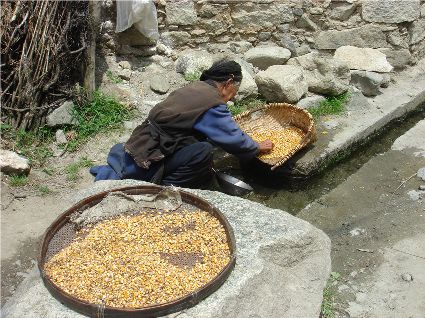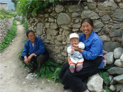 那天清晨,我們一行就乘坐曉雨哥所開(kāi)轎車(chē)從康定城出發(fā)了。從顯得很懸的山路上到位于山頂平壩的嵐安古鎮(zhèn)時(shí),才8點(diǎn)過(guò)一點(diǎn)。朝鎮(zhèn)里走去,先后見(jiàn)到了從地里背洋芋回家的小孩、從地里收了豆菽枯藤的中年人等。