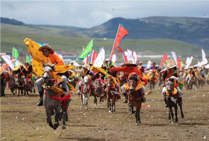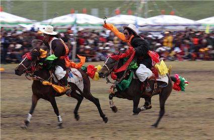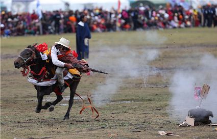 近日,在理塘縣奔戈鄉(xiāng)薩戈村八一賽馬場,來自全縣各鄉(xiāng)鎮(zhèn)近千名牧民進行了傳統(tǒng)的馬術表演,他們以高超的騎術展演了拾哈達、馬上射擊、馬上射箭、鐙里藏身、五彩凌空等馬術技巧,把歡樂帶到草原,讓當?shù)啬撩窈捅姸嘤慰拖硎芰艘粓鲆曈X盛宴。