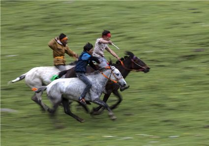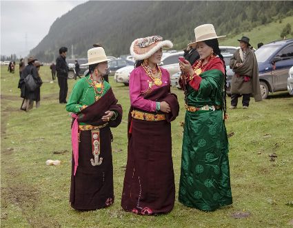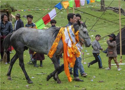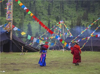 夏天是草原最美的季節(jié),道孚縣玉科草原在這個(gè)季節(jié)里正舉辦久負(fù)盛名的賽馬活動。五顏六色的彩帶飄舞在牛毛大帳篷周圍,喜慶氣氛四處洋溢。來自遠(yuǎn)近牧區(qū)的親屬也專程趕來玉科草原訪親會友,參與賽馬角逐,濃郁的民族盛會令人耳目一新。