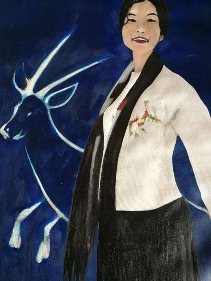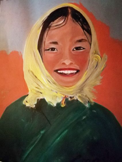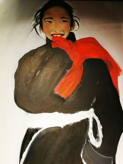 畫畫三年多了。十三歲寫詩;到了高原后,方開始創(chuàng)作長篇小說。在上海,我做過畫廊。但要說斗膽動筆畫幅肖像。我是在白度母唐卡前燃了三炷香的。包括在咖啡店現場作畫。到京城繼而國外辦畫展,我認為都是因了我把畫布當成了詩稿的緣故。于是,大家喜歡我這種野路子,天馬行空,可又不舍方圓的創(chuàng)作手法。接下來,歐洲、東京還會有我的系列展覽。
