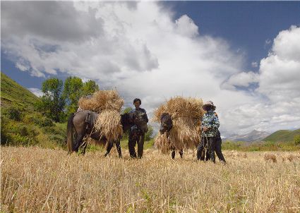 八月起迄,當(dāng)你翻越西出爐關(guān)第一隘口的折多山,下山十里就會(huì)看到山地田野里成熟的青稞、麥子象展開一頁(yè)頁(yè)金黃的詩(shī)篇涌進(jìn)眼里。那大地山坡起伏驛動(dòng)的金箔等待著走進(jìn)主人的碉樓……這個(gè)時(shí)候,正是秋收的開始。