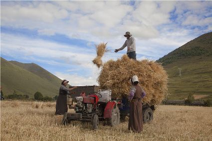 聯(lián)合收割機(jī)已在高原大地施展威力。那些平坦的大地里,拖拉機(jī)的穿梭,收割機(jī)的鳴唱,耳聞目睹,隨外可見。在山地間,大型機(jī)械無法進(jìn)入的地方,原始的勞作仍沒失去它本身的價(jià)值。“汗滴禾下土,粒粒皆辛苦”的場(chǎng)面仍然存在……農(nóng)人的歡歌喜語(yǔ)浸漫于天地間,豐收的喜悅早把辛勤的勞作沖淡。