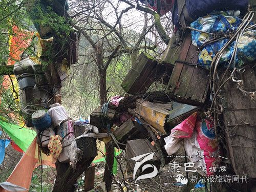 樹(shù)葬大都是13歲以下的未成年人。一般家庭幼兒死亡率高的就把木箱掛在高處,女嬰死后一般掛在最下端,有的則將尸體火化后裝入泥罐內(nèi)再懸掛在杉樹(shù)上。