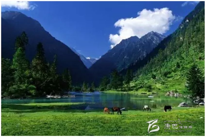 蓮花湖位于康定縣普沙絨鄉(xiāng)苦西絨山谷中。夏季如鏡的水面倒影著森林和天空,寧?kù)o而致遠(yuǎn),湖泊周?chē)玺浯浒惚叹G的草坪,成群的牛、羊如珍珠般撒落在草原上。秋季,滿山色彩絢麗,多姿多彩的群山像淋透了顏料,紅色、黃色、青色、綠色,映襯藍(lán)藍(lán)的天空。