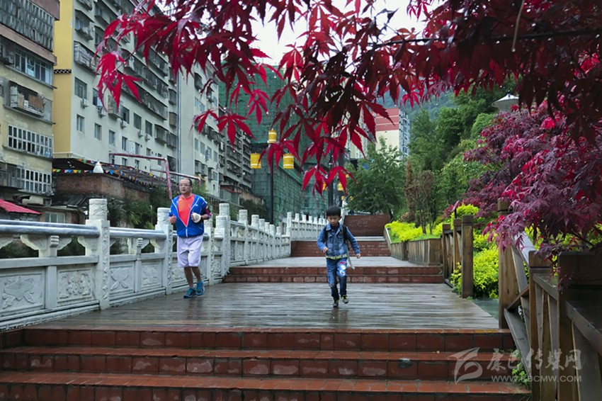 圖為晨練的市民和上學(xué)的小朋友愉快地通過阿里布果步游道。(馮光福 攝影報道)
