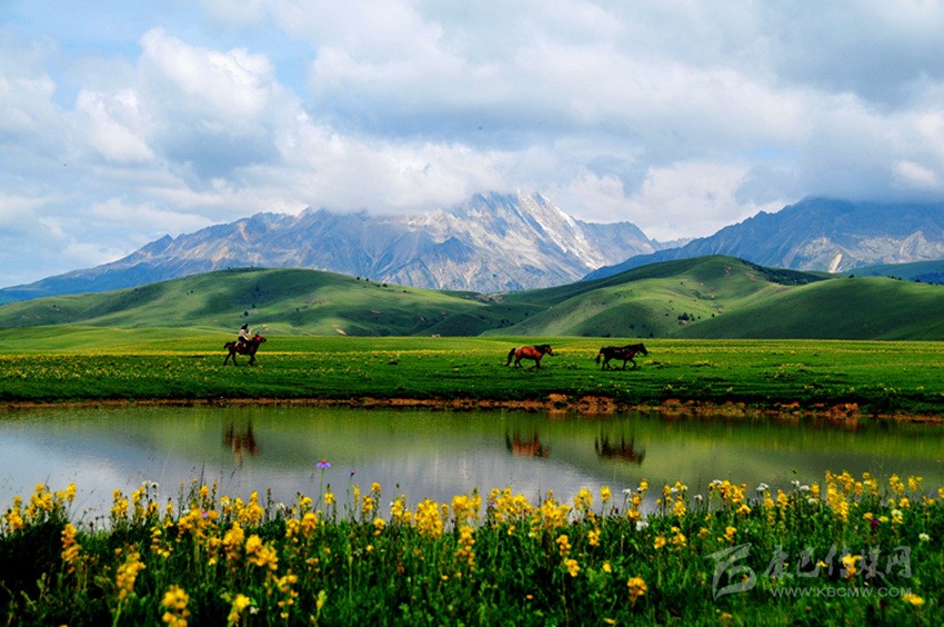 夕陽照耀湖水,閃著金銀光;綠樹撐著青天,到處莽蒼蒼;牧民家的房子,五彩斑斕樣;藍(lán)色天空之上,白云在飄蕩;青石河岸之畔,繽紛百花香……這里是寫生的圣殿,這里有攝影的天堂,這里是讓人魂?duì)繅艨M的夢里仙鄉(xiāng)。