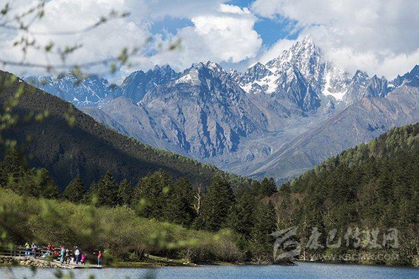 七色海左側(cè),碧空下雪峰挺拔,銀光閃爍,圣潔而神秘,其狀恰如觀音菩薩足下的蓮臺,故名蓮花山。據(jù)當(dāng)?shù)夭孛裰v,一年之中只有三分之一時間蓮花山才露出來,不得不說,這次來木格措的運氣實在太好,蓮花雪山映襯著美麗的七色海,宛如一幅極美的高原畫卷。