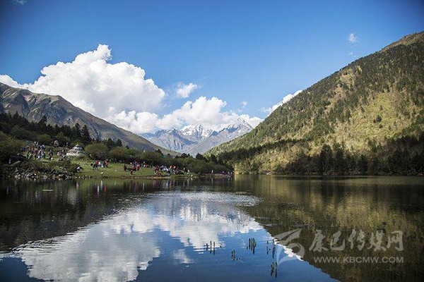 藥池沸泉一側(cè)是風(fēng)景秀美的俄瑪錯,上頂藍天白云和雪山,下踏森林綠水,讓人透心舒暢。