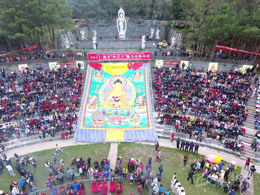 早上6點,跑馬山索道入口已聚集了不少群眾;上午8點,跑馬山情歌坪已被圍得水泄不通;上午9點,“四月八”曬佛儀式正式開始。伴著悠揚的佛陀吟誦和裊裊的煨桑香煙, 巨型釋迦牟尼佛像緩緩揭開蓋簾布展現(xiàn)在陽光之下;成群的青年男女向佛像投去代表祝福和敬意的哈達,虔誠的信徒向其朝拜、叩首。整個過程肅穆而莊嚴(yán)。