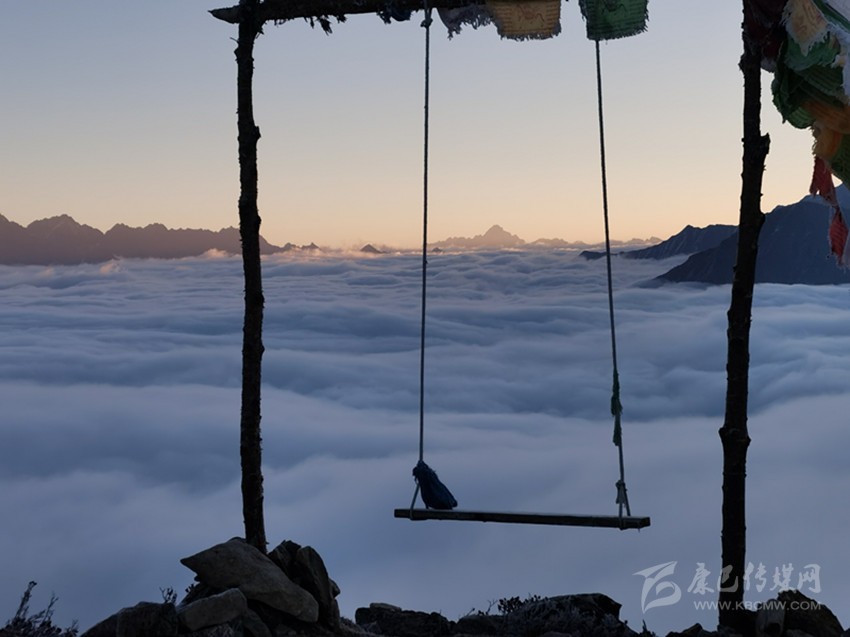 清晨,坐在網(wǎng)紅多吉的秋千上,蕩著秋千看霞光里的云起云涌,美,不可言說(shuō)。