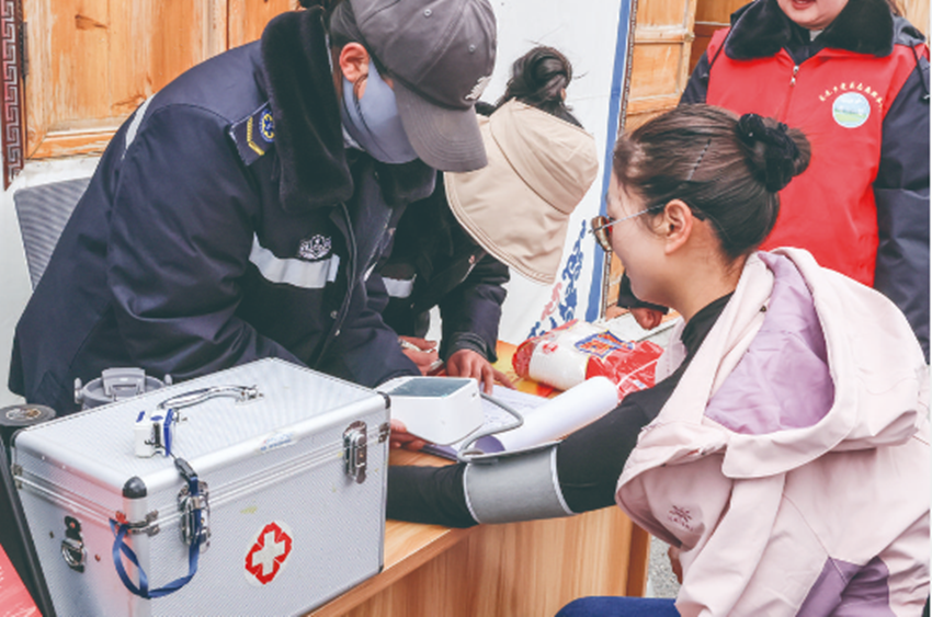 “五一”假期,理塘縣在國省干道沿線、景區(qū)景點設(shè)立了19處志愿服務(wù)站。每個點位配備黨員志愿者、醫(yī)務(wù)志愿者和文明旅游志愿者5至6名,助力營造暖心、舒心、安心的高原旅游環(huán)境,提升游客旅游出行的體驗感、安全感。圖為志愿者正在為游客免費測量氧飽和度和血壓。 殷潔 葉強平 攝