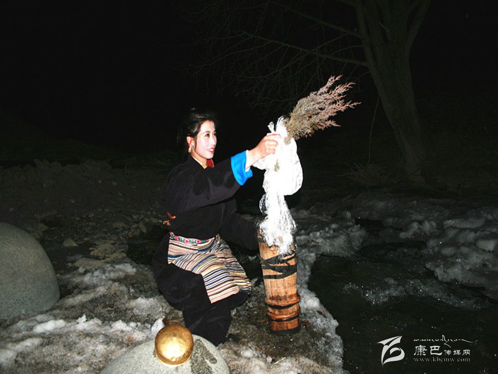 在除夕這天,家里的婦女會(huì)把庭院,房屋重新打掃一遍。把垃圾再清理一次。因?yàn)榱?xí)俗認(rèn)為,初一掃地和除垃圾會(huì)把一年的財(cái)運(yùn)和好運(yùn)都掃走。這天,大人小孩還要忙著洗頭、洗澡,搞好個(gè)人清潔衛(wèi)生。而除夕之夜最重要的一個(gè)儀式是“搶頭水”。(新年的第一桶水—晨星水)。傳說(shuō),晨星水是人間最吉祥的水。它可以獻(xiàn)神,可以潔身,可以祛病,洗滌一切污垢和不祥,帶來(lái)平安和幸福。從除夕夜十二時(shí)開(kāi)始,一個(gè)個(gè)懷抱柏樹(shù)枝和哈達(dá)的姑娘或小伙子們披著繁星,爭(zhēng)先恐后地去背晨星水。第一個(gè)先到河邊的要熏燃桑煙,并用哈達(dá)繞上柏樹(shù)枝蘸水向空中拋灑三次,并把柏樹(shù)枝放在河邊。背回的晨星水首先要供奉佛祖。然后才可以用來(lái)燒茶、洗漱。而家里的五谷斗上則盛滿了糌粑、炒青稞粒、人參果等食品,上插青稞穗,也有在八寶碗里用糌粑和五彩酥油做成“切巴”,供奉在佛堂里。這一切都是為了祈禱來(lái)年風(fēng)調(diào)雨順、人畜兩旺、喜獲豐收。除夕夜,在正房桌子上還要擺上各式油炸果子、牛肉坨坨、糖果以及青稞美酒、飲料等等美味佳肴,開(kāi)始迎接新年的到來(lái)。
