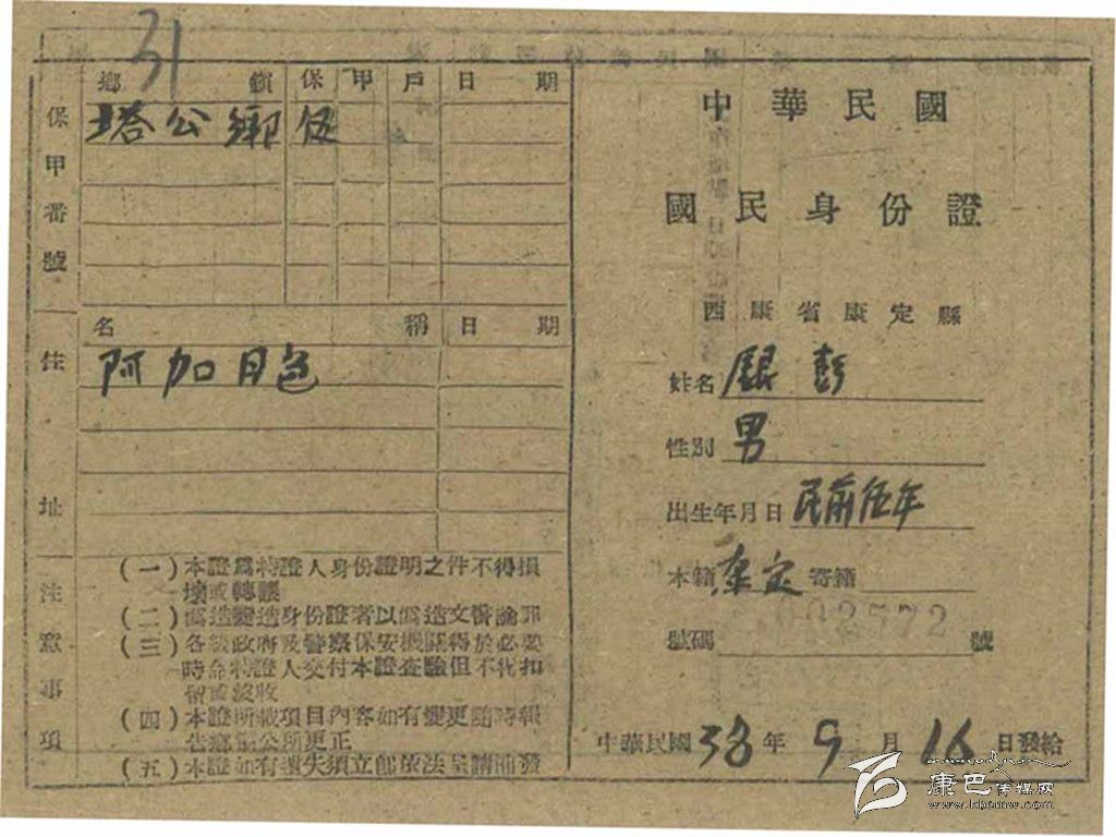 這張看似簡陋的紙張,就是到了1949年才發(fā)給這位居住在塔公鄉(xiāng)、名叫“銀彭”這個人的國民身份證,而對于今天的我們則是難得一見的珍貴檔案材料。