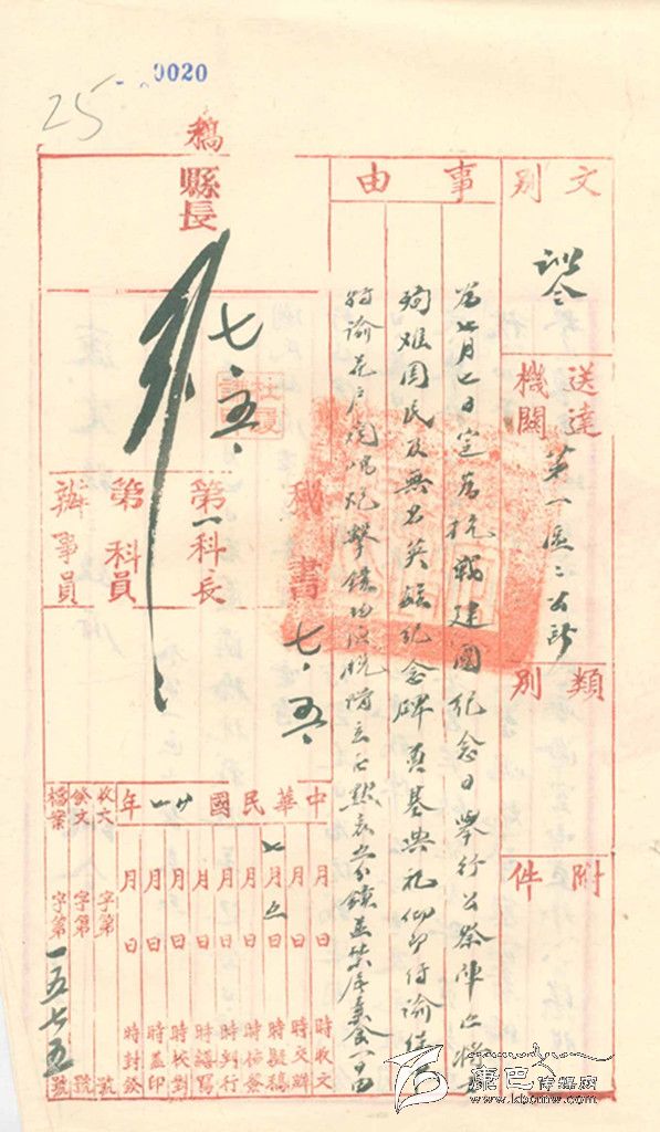 民國27年,即1838年7月5日,康定縣政府縣長杜履謙發(fā)出“訓(xùn)令”,內(nèi)容如下:“查7月7日為盧溝橋抗戰(zhàn)周年紀(jì)念日,經(jīng)民國政府軍事委員會(huì)電請(qǐng)行政院特令各省市、鎮(zhèn):特定是日為抗戰(zhàn)建國紀(jì)念日。是日全體民眾均應(yīng)向抗戰(zhàn)陣亡將士及死難國民舉行公祭,并舉行無名英雄紀(jì)念碑奠基典禮。正午12時(shí),聞中山臺(tái)鳴炮,警察籌備處擊鐘,本城全市民,無論室內(nèi)室外,一律脫帽立正默哀五分鐘。禁止屠宰,素食一日。此令”。