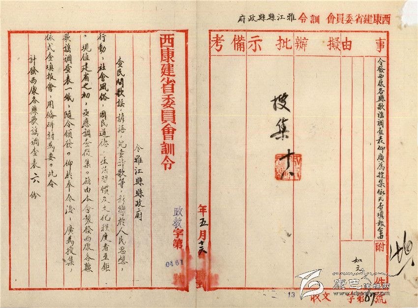 訓(xùn)令題目是“令發(fā)西康各縣歌謠調(diào)查表仰廣為收集依式查填報會”,由此可知,西康其他各縣也收到了同樣的訓(xùn)令。其內(nèi)容為:查民間歌謠、諺語,兒童詩歌等,影響于人民思想、行動、社會風(fēng)俗、國民道德、生活習(xí)慣及文化程度者至巨。現(xiàn)值建省之初,急應(yīng)調(diào)查征集,茲由本會制發(fā)西康各縣歌謠調(diào)查表一紙,隨令頒發(fā)。仰于奉令后,廣為收集,依式填報會,備研討為要。此令,計發(fā)西康各縣歌謠調(diào)查表6份。署名是“西康建省委員會”。