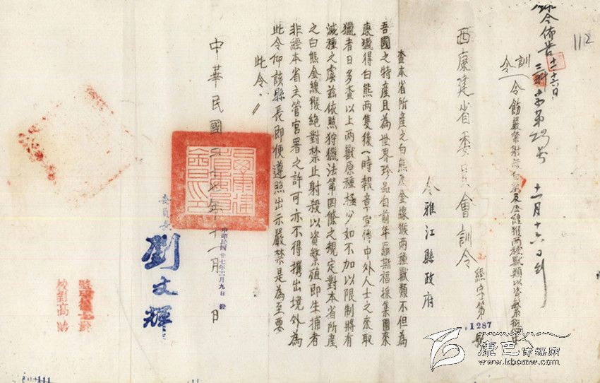 民國27年(公元1938年),“西康省建省委員會”發(fā)出“經(jīng)字第1287號”訓令,這是一份難能可貴的保護野生動物的訓令,訓令說:“查本省所產之白熊及金線猴兩種獸類,不但為吾國之特產,且為世界珍品。自前年羅斯福采集團來康獵得白熊兩只后,一時報章宣傳,中外人士之來取獵者日多。查以上兩獸原種極少,如不加以限制,將有滅種之虞。茲依照狩獵法第四條之規(guī)定,對本省所產之白熊、金線猴絕對禁止射殺,以資繁殖。即生捕者非經(jīng)本省主管官署之許可,不得帶出境外。為此令仰該縣長即便遵照出示嚴禁是為至要,此令。”訓令最后署有“西康建省委員會委員長劉文輝”的簽名。