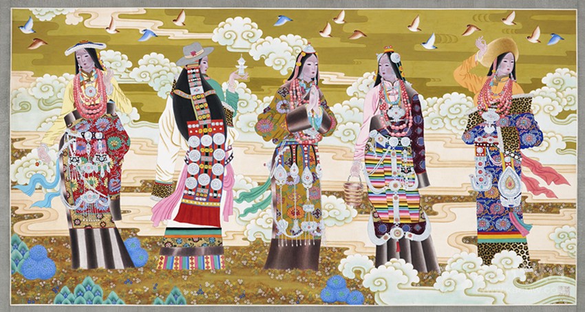 青藏高原有著曠遠(yuǎn)弘大的人文地理,有著神秘久遠(yuǎn)的宗教文化傳承,正是這蒼茫大地孕育了藏族人;正是這片極度追求審美體驗(yàn)并把生活高度藝術(shù)化的疆域,滋養(yǎng)了西藏藝術(shù)。從早期的巖畫、旗幡畫、唐卡、壁畫,再到當(dāng)代的丹青重彩,無不生發(fā)于這片神奇高原,皆是中華民族文化寶庫(kù)中燦爛的牟尼寶珠。唐卡繪畫肇啟于松贊干布隆興之時(shí),向南學(xué)習(xí)印度、尼泊爾布畫,往西受到犍陀羅藝術(shù)浸潤(rùn),向東融合唐、宋、明、清之審美,再集藏地宗教文化、民族審美熔為一爐,鑄就一千三百年唐卡繪畫之法脈。它不僅是獨(dú)具魅力的藏文化之血脈源流,更是各民族文化交融、和諧互生的典范,對(duì)世界藝術(shù)有著深遠(yuǎn)的影響。