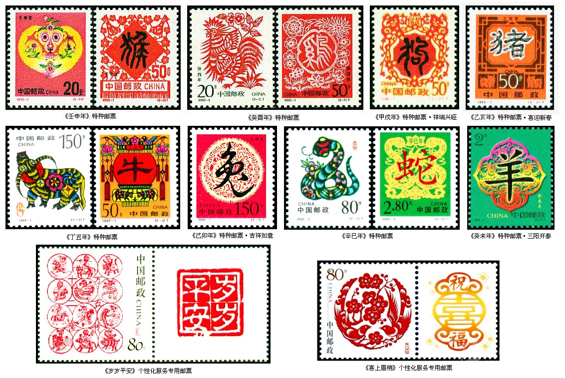剪紙作為藝術(shù)百花園中的一朵奇葩,在我國(guó)郵票圖案設(shè)計(jì)中應(yīng)用也非常廣泛。由于傳統(tǒng)的民間剪紙有著濃郁的吉祥喜慶氣氛,因此在我國(guó)近些年發(fā)行的生肖郵票中多次出現(xiàn)剪紙藝術(shù)。在第二輪12套24枚生肖郵票中的剪紙圖案分別有1992年《壬申年》的“猴桃獻(xiàn)瑞”和“喜鵲登梅”、1993年《癸酉年》的“雄雞報(bào)曉”和“四季吉祥”、1994年《甲戌年》的第二枚“祥瑞興旺”、1995年的《乙亥年》的第二枚“喜迎新春”、1997年的《丁丑年》的“金牛奮蹄”和“牛耕年豐”、1999年《己卯年》的第二枚“吉祥如意”、 2001年《辛巳年》的“祥蛇祝福”和“祥運(yùn)普照”以及2003年的《癸未年》第二枚“三陽(yáng)開(kāi)泰”等。這些郵票中剪紙圖案有的直接取材于民間,有的則是在原作基礎(chǔ)上再創(chuàng)作。如“雄雞報(bào)曉”一枚,圖案選用的是河北省獻(xiàn)縣本齋鄉(xiāng)鄧家莊蔡蘭英老人的剪紙“百雞圖”中的一幅,而“金牛奮蹄”一枚,圖案是根據(jù)山東高密民間藝人齊秀花的剪紙“媳婦騎牛”再加工創(chuàng)作而成的。在我國(guó)發(fā)行的祝福系列個(gè)性化服務(wù)專用郵票中也有吉祥喜慶的剪紙圖案,即2005年11月6日的《歲歲平安》和2005年11月11日的《喜上眉梢》等。