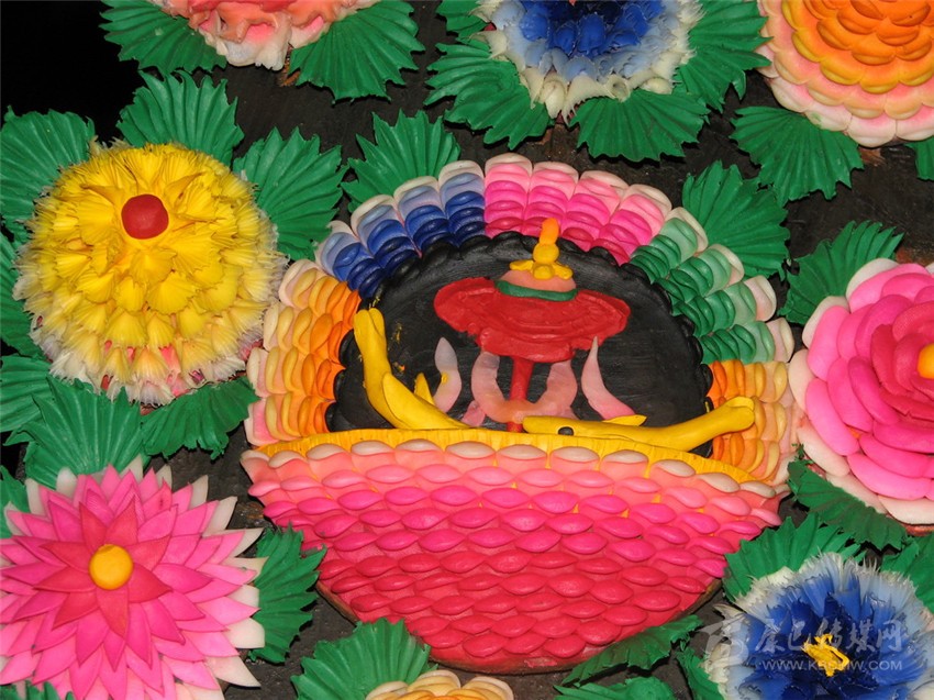 酥油花酥油花雖名曰“花”,但其題材多樣,內(nèi)容豐富,主要以佛祖神仙、菩薩金剛、飛禽走獸、花鳥魚蟲、山林樹木、花卉盆景組成各種故事情節(jié),形成完整的立體畫面。它的造型特點(diǎn)和手法類似國外盛行的臘像藝術(shù),但不宜長期保存。酥油花藝術(shù)繼承藏傳佛教藝術(shù)的精、繁、巧的特點(diǎn),在一個有限的空間中容納極多的內(nèi)容。大至一米到二米,小至十到二十毫米的人物走獸,個個精到,力求寫實,而其姿態(tài)神韻力求傳神達(dá)意。在畫面布局上則繼承佛教壁畫中“異時同地”的處理方法,在同一畫面中將一個完整的故事內(nèi)容同時塑造出來。如大型酥油花《釋迦牟尼本生故事》。 酥油花的制作必須在冬季低溫下進(jìn)行,因而塔爾寺酥油花都在每年農(nóng)歷正月十五日塔爾寺燈節(jié)展出,屆時來自西藏、內(nèi)蒙古,四川等地的農(nóng)牧民及海內(nèi)外游人云集山之中,山上山下,寺宇周圍,入山人海,為一睹晶瑩剔透的酥油花。