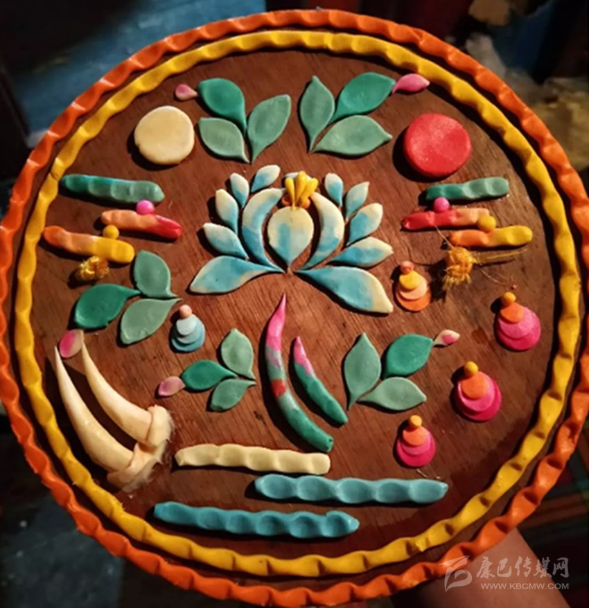 有傳說稱641年文成公主進(jìn)藏,帶去一尊釋迦牟尼12歲等身像并將其供奉于拉薩的大昭寺,當(dāng)?shù)厝罕娪盟钟妥龀苫ü┇I(xiàn)于佛前,以示崇敬之心,后各藏傳佛教寺院相繼使用,視為禮佛珍品,獻(xiàn)酥油花遂成為正月祈愿大法會的重要內(nèi)容。在發(fā)展過程中,酥油花的塑造方式、花色品種、內(nèi)容題材和工藝技巧都不斷發(fā)生著變化。