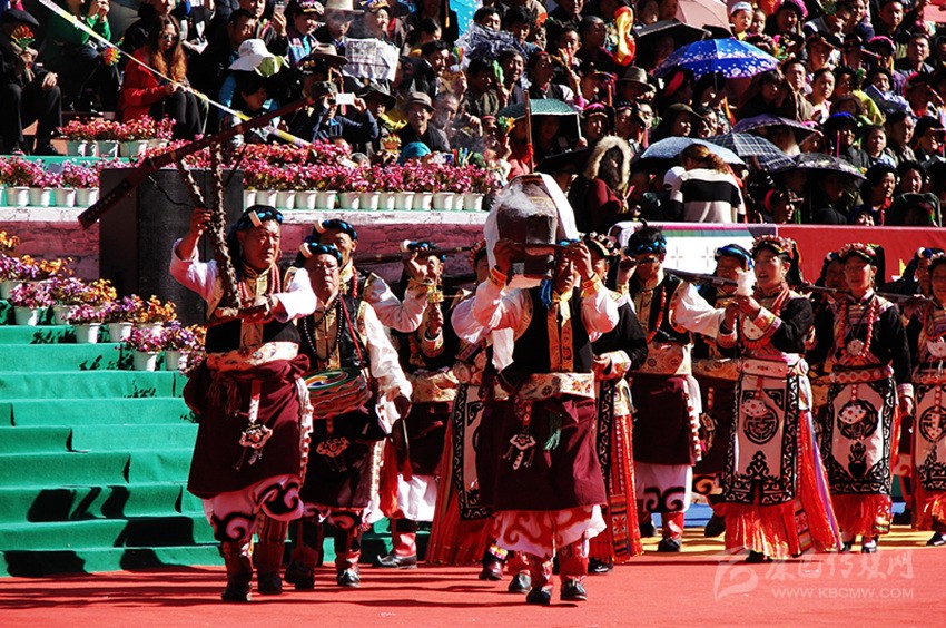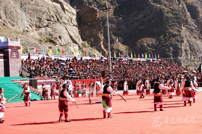 槍舞,嘉絨語(yǔ)中稱(chēng)為“訥沖呷兒”,主要是在祭祀、集會(huì)、節(jié)日時(shí)表演的一種近似于戰(zhàn)術(shù)的舞蹈。在舞蹈中,舞者圍成一個(gè)圓圈,手持明火槍?zhuān)骰饦專(zhuān)亲钤绲囊环N真正適于在戰(zhàn)場(chǎng)上為軍事目的使用的火槍。槍膛為一根圓柱形的鐵筒,筒口直徑為三厘米左右,在槍膛底部,有一個(gè)小圓孔伸出槍管,為導(dǎo)火管。如耳朵狀,因此也稱(chēng)為槍耳,主要是用來(lái)點(diǎn)火的地方。圓筒固定在堅(jiān)硬的木托頂端。這種輕火器或者說(shuō)小型火炮使用的是形狀不規(guī)則的彈丸,即不大的實(shí)心彈,它緊貼大?;鹚幹瞥傻难b藥,借緊挨導(dǎo)火孔的火繩發(fā)射。