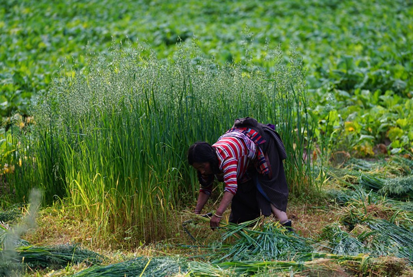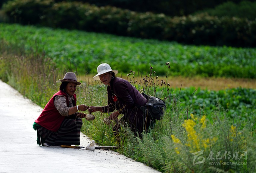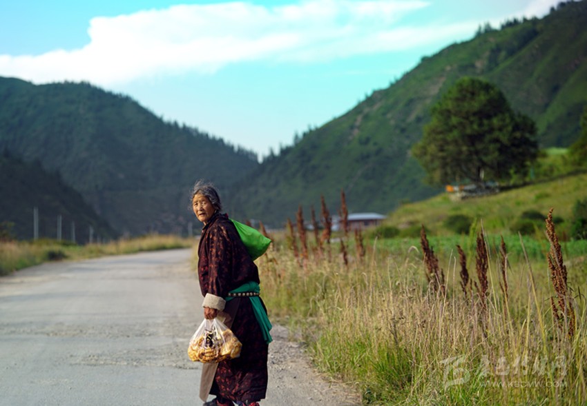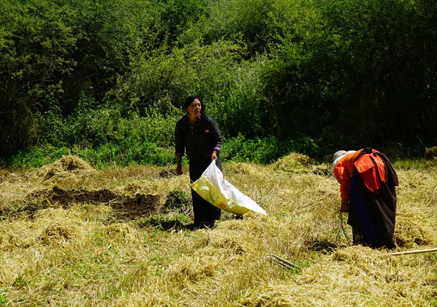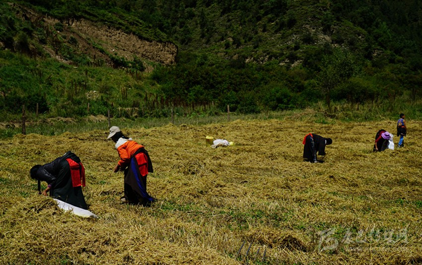 開始收割了,從坡地到川地,到處是收割機的聲音。青稞是車巴溝的主要作物,因為要磨青稞面,要吃糌粑。村里人忙得團團轉(zhuǎn),收割機開過去,大家就跟在后面撿穗子。如此往復(fù),一直要到糧食拉到家里。
