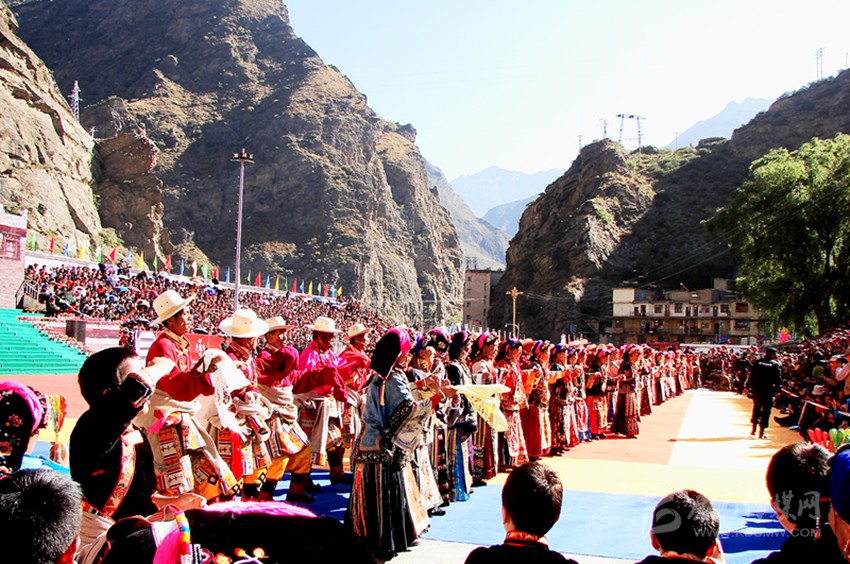 行不多時,一座美麗的村寨就出現(xiàn)在面前。眼前,一幢幢白色的藏房就散落在這如如世外桃源般的山坳里,它就是有著歌舞之鄉(xiāng)美譽的宅龍村寨。山寨中央,一條小徑將整個村寨一分為二,小徑以上的村寨為上宅龍,小徑以下的為下宅龍。因為這里曾是守備千總的衙門駐地,因此,與周邊使用嘉絨藏語的村寨比較,這里的人們習(xí)慣使用嘉絨藏語中的敬語交流,其語調(diào)柔和,語速較緩。這里的鍋莊舞獨樹一幟,服飾更是一絕。