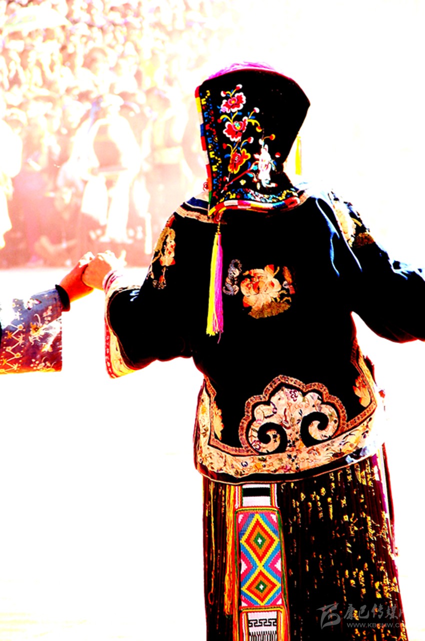 縱觀宅龍服飾,我們不禁產(chǎn)生這樣的疑問。在清朝時期,社會等級森嚴,服飾之上的圖案最能代表主人身份的高低,因此決不能濫用。而這里的女性服飾上卻繡有龍虎、麒麟等官員服飾才有的圖案,確實讓人奇怪。不過,對于這種服飾的由來,從當(dāng)?shù)匚幕耸靠谥幸驳弥艘恍┬畔?。一是在解放前,由于守備、千總與大金川土司、沃日土司等有過聯(lián)姻。土司女兒入嫁這里時,曾帶來陪奩數(shù)十箱。除了金銀首飾外,大多數(shù)都是入嫁女的服飾,其中就不乏這種服飾。后來,這些服飾或賞賜給屬民,或遺失后散落到民間,才使得這些服飾走進了尋常百姓家,成為傳家寶。二是在清朝時期,內(nèi)地的一些商家趕著馱運貨物的馬匹翻越巴朗山,將這些貨物運送到懋功縣(今小金縣),用物物交換的方式換取當(dāng)?shù)氐拿F中藥材,其中就不乏這種絲織品服飾。那時候,宅龍村寨離懋功縣只有四十余里的路程,因此,這些絲織品也就走進了百姓家里。一直珍藏到現(xiàn)在,才有了享譽整個嘉絨地區(qū)最美服飾的榮譽。