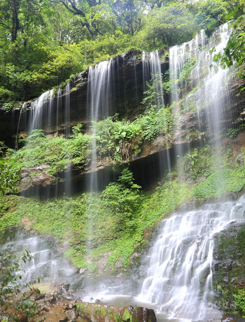 我的腳步?jīng)]有停留,再轉(zhuǎn)過一個彎道,瀑布就不見了,像我樸素的心歷經(jīng)了一場美妙的幻境一樣忽然。我聽到前方有更大的水聲跌落,仰頭就見一道更高的瀑布從高山峭壁之間,凌空垂下,水花飛濺的聲音響徹山谷。腳下的石徑像有生命似的蜿蜒穿入了瀑布之中,我登上去,站在其間看著瀑布從眼前落下,大口呼吸,心胸豁然開朗,這是瀑布給我的啟迪啊。