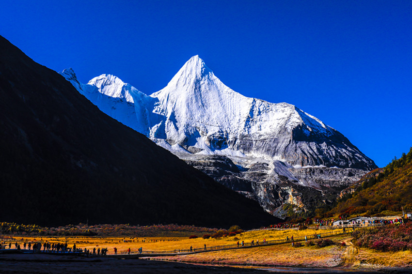 走過山走過水,觀一路秋色,描摹一生的畫卷。在亞丁的晚秋,可以感受“遠(yuǎn)看山有色,近聽水無聲”的畫面,在亞丁的晚秋,可以體驗(yàn)“愁因薄暮起,興是清秋發(fā)”感覺。在亞丁的晚秋,總會(huì)有李清照那句“秋已暮、紅稀香少。水光山色與人親,說不盡、無窮好”在腦海浮現(xiàn)。總感嘆景色太美,文筆笨拙,要是“俱懷逸興壯思飛,欲上青天覽明月”的李白在“抽刀斷水水更流,舉杯消愁愁更愁”的多愁善感里描繪三怙主的雄奇與牛奶海的柔美,那不知道又是一個(gè)多么驚世駭俗的偉大手筆?沒有也許,只有在些許的缺憾中努力書寫屬于這個(gè)秋的一切。是的,秋已暮,珍珠海的水碧波不興,雪山的倒影更顯雄偉與圣潔。秋已暮,五彩山林和潺潺流水纏綿無盡,已經(jīng)把美輪美奐的山水畫鋪展在天地間。秋已暮,牧歸炊煙起,草原已寂靜。