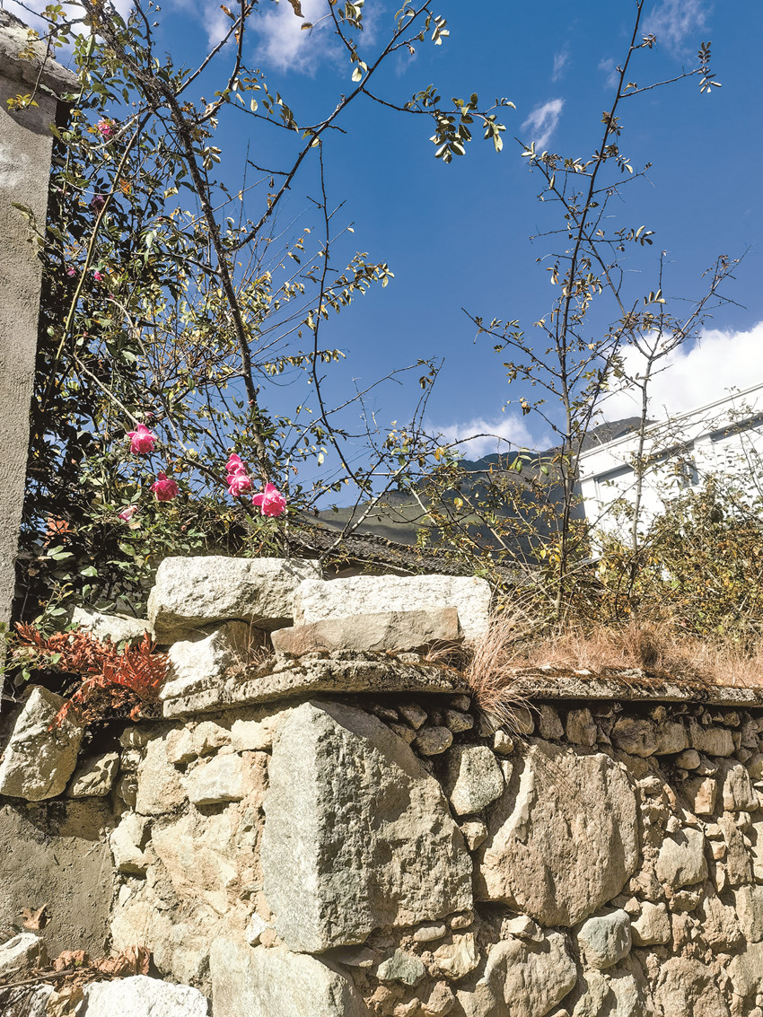在小飯館里簡(jiǎn)單吃了一頓午餐,可惜沒(méi)有嵐安豆花,臘肉倒是如大家說(shuō)的那樣香。吃完飯?jiān)诖遄永锫o(wú)目的的轉(zhuǎn)悠,石頭砌的矮墻將每家每戶的房屋圍成院子,墻頭上的草已經(jīng)泛黃枯萎,偶爾有幾枝玫紅色的月季從墻頭伸出來(lái),給石墻點(diǎn)綴了一些色彩和生機(jī)。石墻與石墻之間,是串聯(lián)起每一戶人家的村間小道,經(jīng)過(guò)幾戶農(nóng)家,腳下硬化的路面斷了,往前延伸的是窄小的泥路,路兩旁有綠油油的菜地,有收割完的玉米地,有一排排的蘋果樹(shù)……往更遠(yuǎn)的地方看去,田地盡頭的山坡上是紅軍紀(jì)念碑,原來(lái)這里可以通往紀(jì)念碑,不過(guò)目測(cè)距離有點(diǎn)遠(yuǎn),收住腳步往回走,沿著村道朝另外一個(gè)方向走走看。前面是散落在小山坡上的幾戶人家,比起之前被石墻圍起看不見(jiàn)樣貌的農(nóng)家,山坡上的這些房子錯(cuò)落有致,清楚的看得見(jiàn)院子的全貌,房屋大多是一層的由石墻瓦頂構(gòu)筑的,每一戶人家都飄揚(yáng)著鮮艷的紅旗。