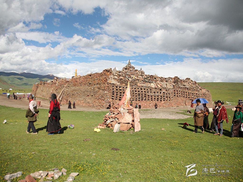 吃完午飯后,大家便走向松格瑪尼石經(jīng)城。短暫的煨桑儀式結(jié)束后,一匹匹高頭大馬繞著石經(jīng)城飛跑,隆達(dá)撒向半空,飄散在雨后的草原上。隨后,專(zhuān)家們走進(jìn)石經(jīng)城,挨個(gè)頂禮了一處石刻造像,據(jù)說(shuō),這一處石刻造像具有加持力,十分靈驗(yàn)??脊艑?zhuān)家們和記者繞松格瑪尼石經(jīng)城走完一圈后,便離開(kāi),前往須巴神山。